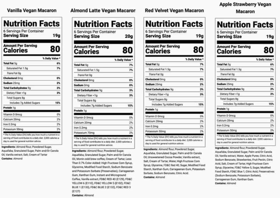 Almond flour, powdered sugar, aquafaba, granulated sugar, palm and/or canola oil, vanilla extract, salt, cream of tartar.