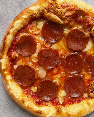 Ingredients: Crust (Enriched flour [Unbleached Wheat flour, Malted Barley flour, Niacin, Reduced Iron, Thiamin Mononitrate, Riboflavin, Folic acid], Filtered Water, Yeast, Sea Salt, Olive Oil, Organic Brown Sugar), Tomato Sauce (Tomatoes, Basic, Lemon juice, Apple Cider Vinegar, Salt), Vegan Cheese (Filtered Water, Coconut Oil, Potato Starch, Tapioca Starch, Sunflower Oil, Sea Salt, Calcium Citrate, Natural flavour [Vegan sources], Chickpea Protein, Konjac and Xanthan Gums, Potato Protein, Annatto and Turmeric extracts [Colour], Powdered Cellulose added to prevent caking), Beyond Plant-Based Pepperoni Slices (Water, Refined Salt, Methylcellulose, Natural flavours [with Celery Oil], 2% or less of Rice Protein, Paprika, Yeast extract, Mung Bean Starch, Garlic Powder, Spices [including Mustard], Ascorbic Acid, Vegetable juice colour, Red Beet powder colour, Lycopene colour [from Tomato], Extractives of Paprika, Natural smoke flavour), Garlic.